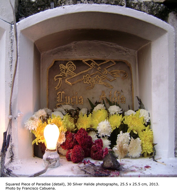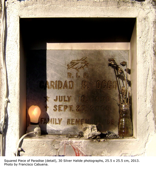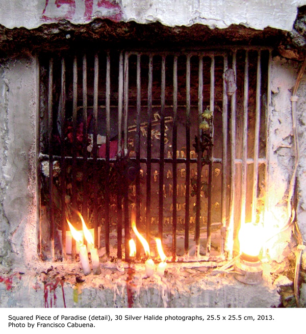 An additional element in Testimony of What Remains are the photographs taken by Dy during the commemoration of All Souls Day in 2012. Seen in the fourth floor’s right atrium, Earthly Pilgrimageis a series of large tarpaulin prints that captures the different scenes from one specific section of the Carreta cemetery in Cebu City. Back inside the gallery, the photo installation Squared Piece of Paradise, gives viewers a closer look inside each crypt.
